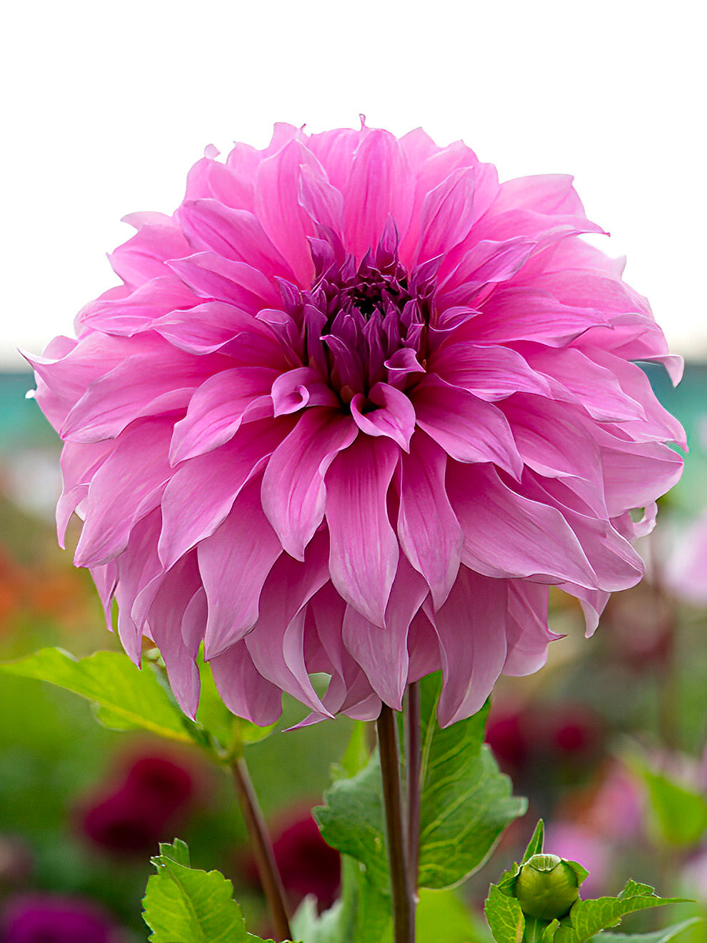 Dahlia 'Vassio Meggos' är en imponerande informell dekorativ dahlia med stora, rundade blommor i en mjuk lavendelrosa nyans. De breda, spetsiga kronbladen böjer sig elegant bakåt mot stammen, vilket ger blommorna en nästan sfärisk form. Denna dahlia är en sport av den mörkröda 'Spartacus' och har tagit det bästa från sin förälder – storlek, form och färg.